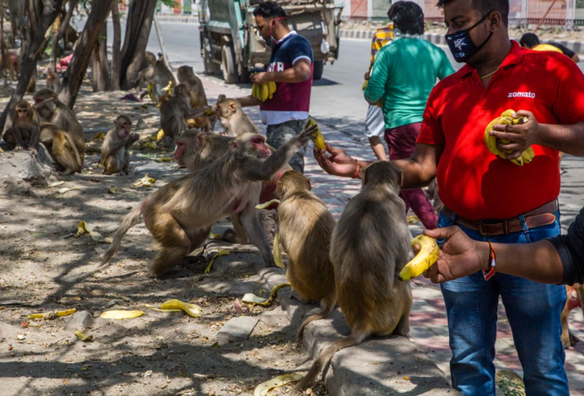 Mężczyźni w New Delhi karmią bananami stado małp, które zaczęły zbliżać się do ludzkich osiedli w czasie ogólnonarodowej kwarantanny ogłoszonej w Indiach. New Delhi, 8 kwietnia. W wielu krajach na opustoszałych ulicach pojawiły się dzikie zwierzęta, które przed pandemią trzymały się od takich miejsc z daleka, bo zazwyczaj były one zatłoczone, pełne samochodów i głośne.