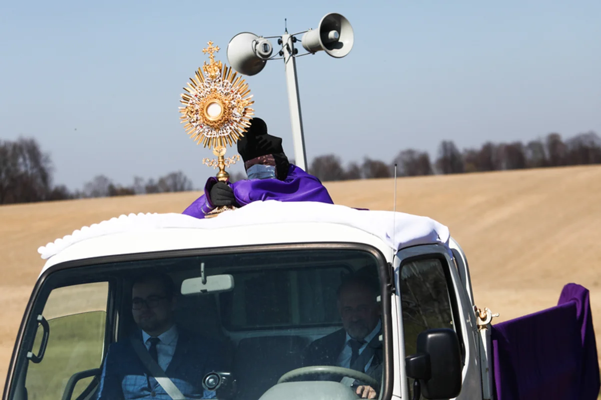 Ksiądz w rękawiczkach i maseczce ochronnej błogosławi z samochodu parafian we wsi Nidek w województwie małopolskim. 5 kwietnia