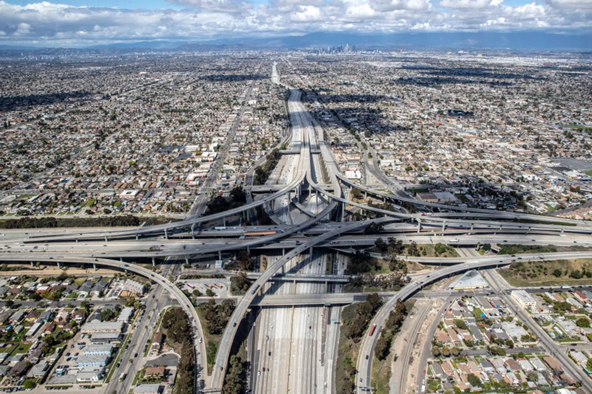 Standardowo zakorkowane, a teraz niemal puste autostrady w godzinach szczytu prowadzące do Los Angeles. Gubernator stanu Kalifornia w związku z pandemią koronawirusa wydał 19 marca "nakaz pozostania w domu". Oznacza on, że otwarte pozostały jedynie te miejsca, które są niezbędne do życia: sklepy spożywcze, stacje paliw, apteki, restauracje oferujące dania na wynos, targi warzywne, instytucje oferujące żywność osobom ubogim i bezdomnym, banki, pralnie oraz niektóre instytucje stanowe i federalne. Mieszkańcy stanu zostali poproszeni o pozostanie w miejscu zamieszkania. 25 marca, Los Angeles, USA