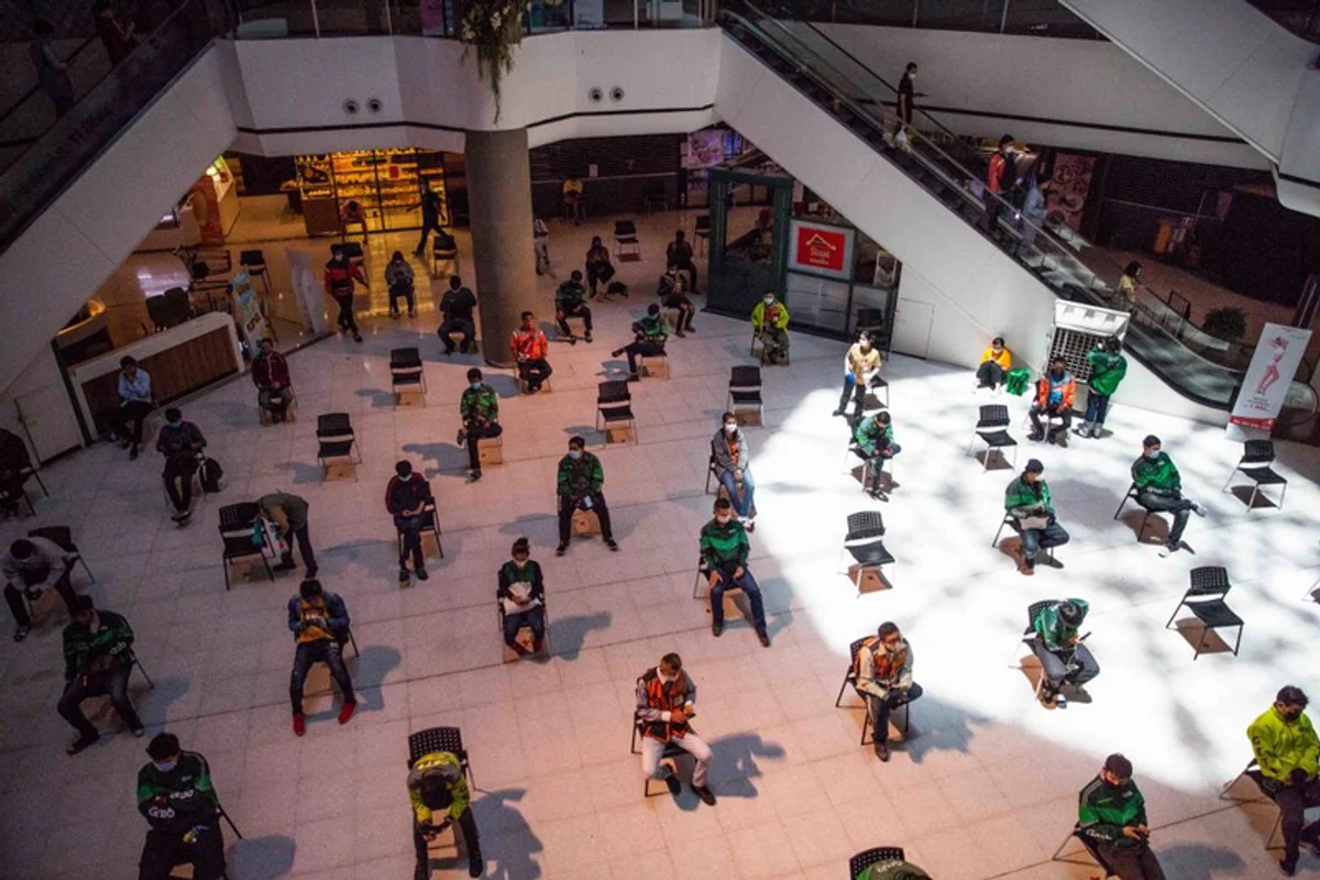 Dostawcy jedzenia czekają na zlecenia w centrum handlowym w Bangkoku, zachowując odpowiednią odległość. 22 marca władze Tajlandii ogłosiły ograniczenia funkcjonowania restauracji - mogą jedynie oferować dania na wynos. Podobnie jak w innych krajach, w tym w Polsce, firmy umożliwiające dostawę jedzenia w tym kraju oferują ją w formule bez kontaktu. 30 marca, Tajlandia