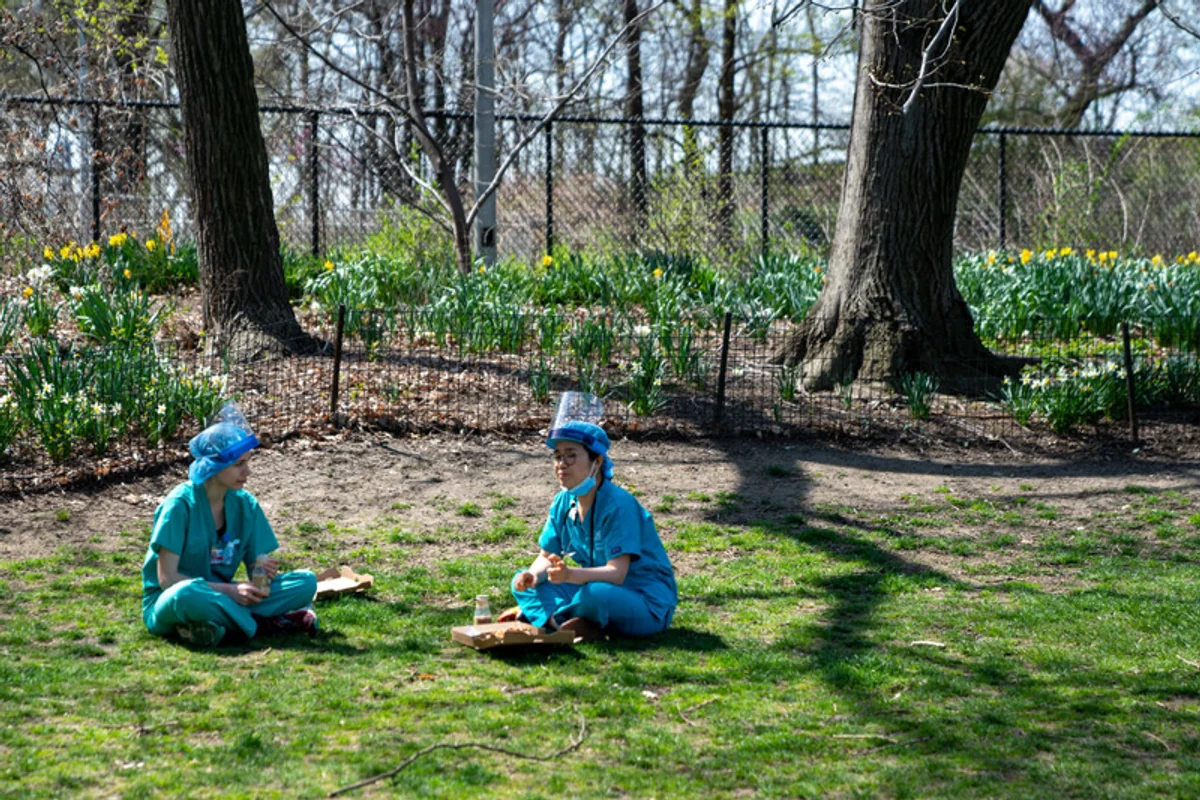 Dwie pielęgniarki na przerwie w Central Parku niedaleko szpitala Mount Sinai. 7 kwietnia, Nowy Jork