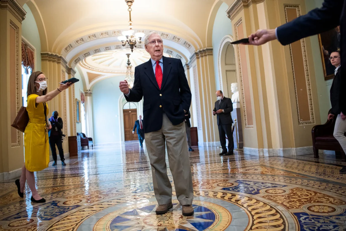 Amerykański senator Mitch McConnell udziela wywiadu dziennikarzom zachowującym stosowną odległość na korytarzu w siedzibie amerykańskiego Kongresu. 9 kwietnia, Waszyngton, USA
