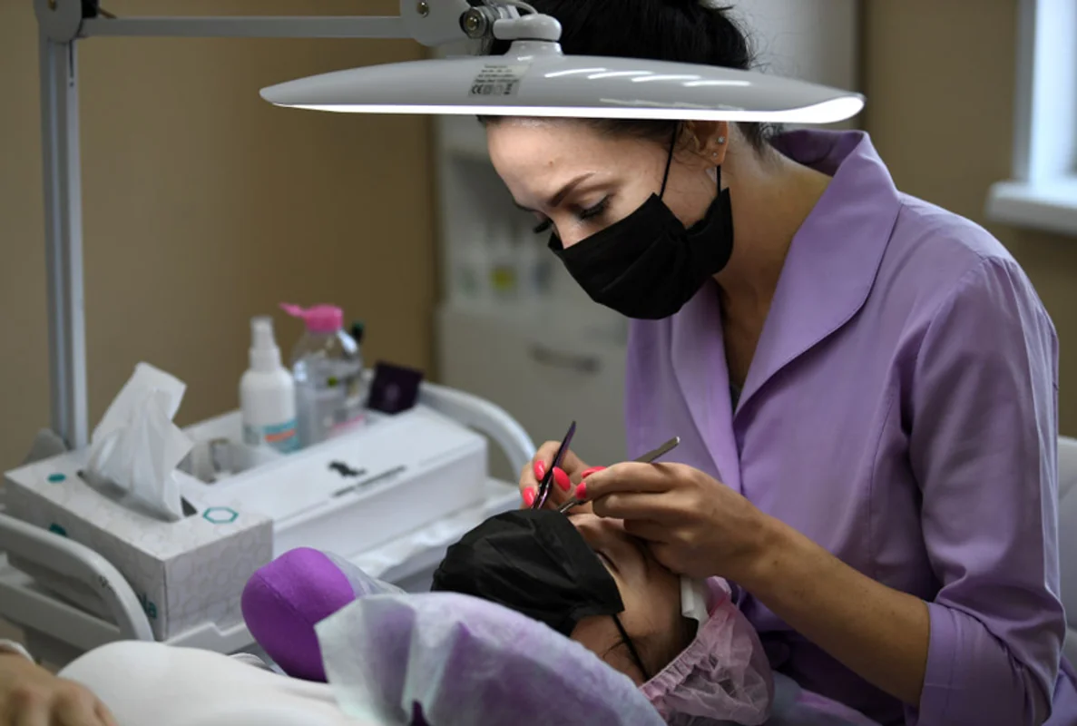 Kosmetyczka w rosyjskim salonie piękności przeprowadza zabieg u klienta. Władze Władywostoku zezwoliły salonom, zlokalizowanym w dużej odległości od miejsc publicznych, na wznowienie działalności od 9 kwietnia. 9 kwietnia, Rosja