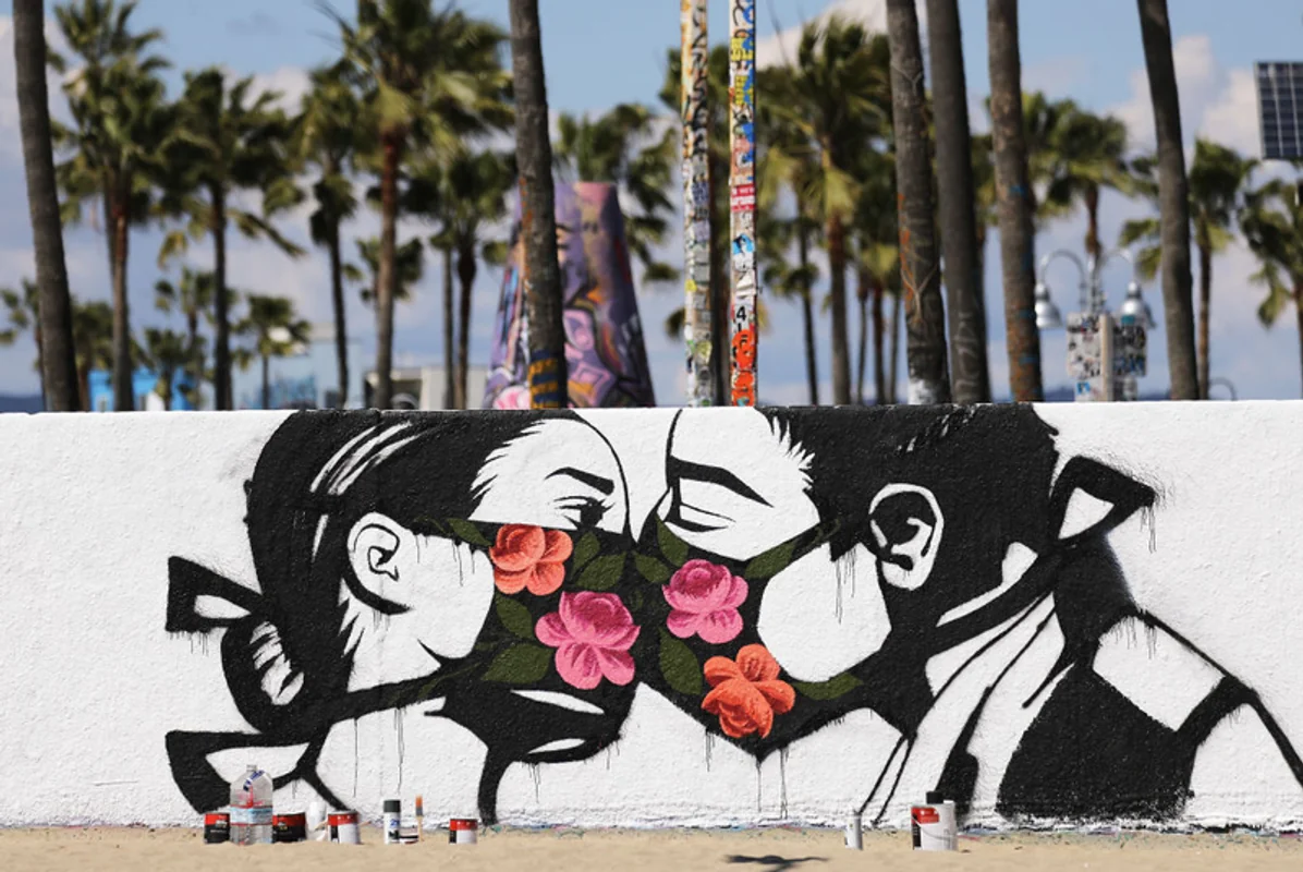 Mural wykonany przez artystkę Pony Wave pokazujący dwie osoby całujące się w maskach, wykonany na murze w słynnej dzielnicy Venice Beach w Kalifornii. 21 marca, Los Angeles