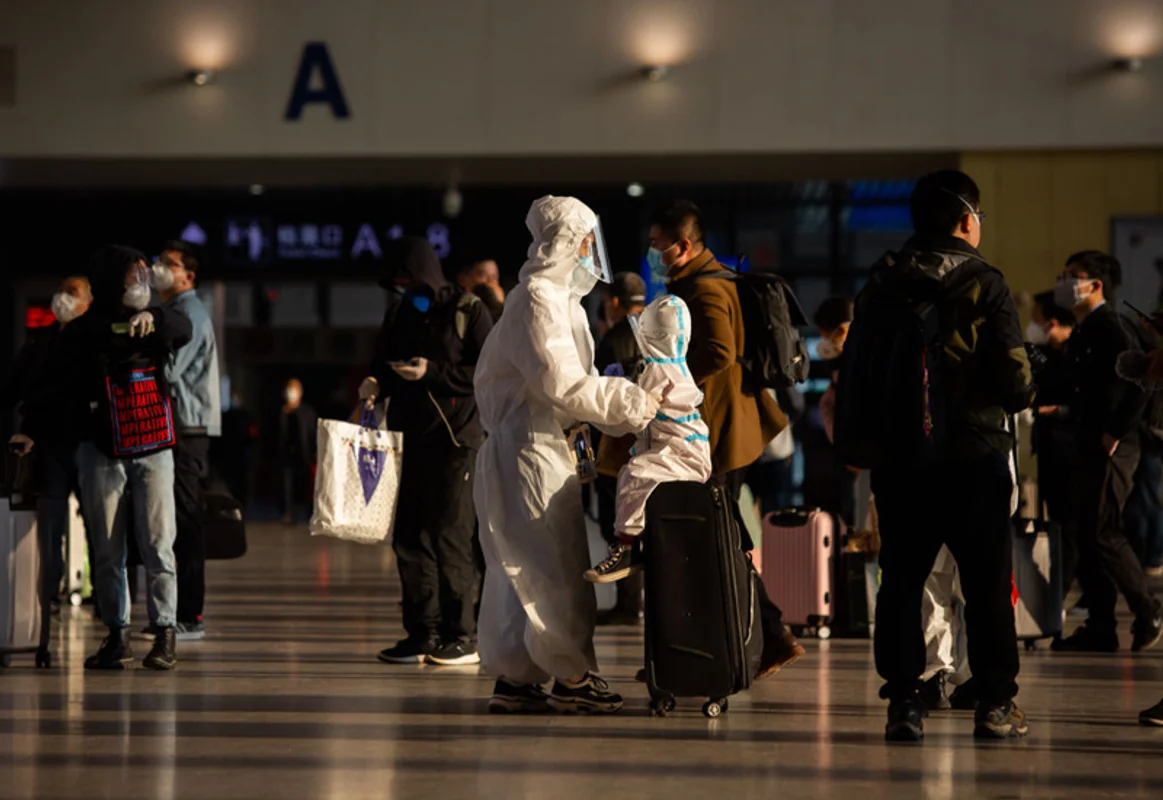 Pasażerowie podróżujący z miasta Wuhan i pracownicy służby zdrowia w specjalnej odzieży ochronnej na stacji kolejowej w Pekinie, są kierowani do autobusów, którymi zostaną przewiezieni do miejsc odbycia kwarantanny. Władze zniosły zakaz podróżowania z miasta Wuhan po 76 dniach izolacji i pozwoliły opuścić miasto zdrowym obywatelom. 8 kwietnia, Pekin, Chiny