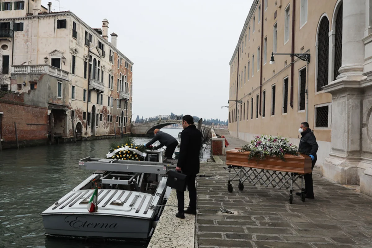 Pracownicy domu pogrzebowego przenoszą trumnę ze szpitala, która zostanie umieszczona na łodzi i przetransportowana prosto na cmentarz. Z powodu pandemii Włochy nałożyły restrykcje na pogrzeby, a także inne obrzędy religijne. Ciała zmarłych są przenoszone bezpośrednio ze szpitala na cmentarze, w pogrzebie może uczestniczyć tylko najbliższa rodzina zmarłego. 10 marca, Wenecja, Włochy
