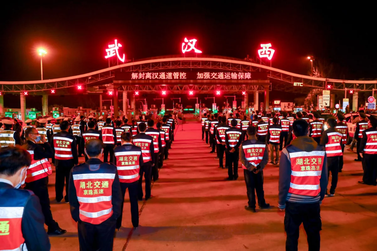 Służby w mieście Wuhan przygotowujące się do otwarcia granic miasta, które zostało odcięte od pozostałej części kraju na 76 dni. 8 kwietnia, Chiny