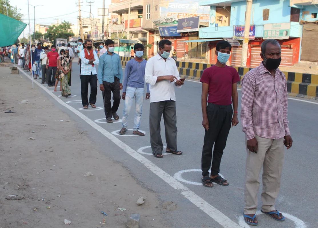 Mieszkańcy Gurugram czekający w kolejce po jedzenie na wyznaczonych miejscach w 15. dniu ogólnokrajowej kwarantanny. 7 kwietnia, Indie
