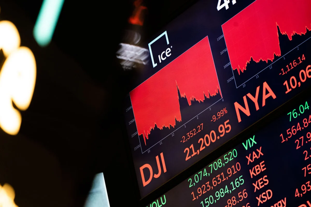 Tablica pokazująca spadki na nowojorskiej giełdzie 12 marca. Tego dnia Stany Zjednoczone w nocy polskiego czasu zdecydowały, że wstrzymają przyjazdy z Europy do USA, a Nowy Jork wprowadził stan wyjątkowy. W kolejnym tygodniu na Wall Street doszło do załamania notowań i najgorszej sesji od 1987 roku.