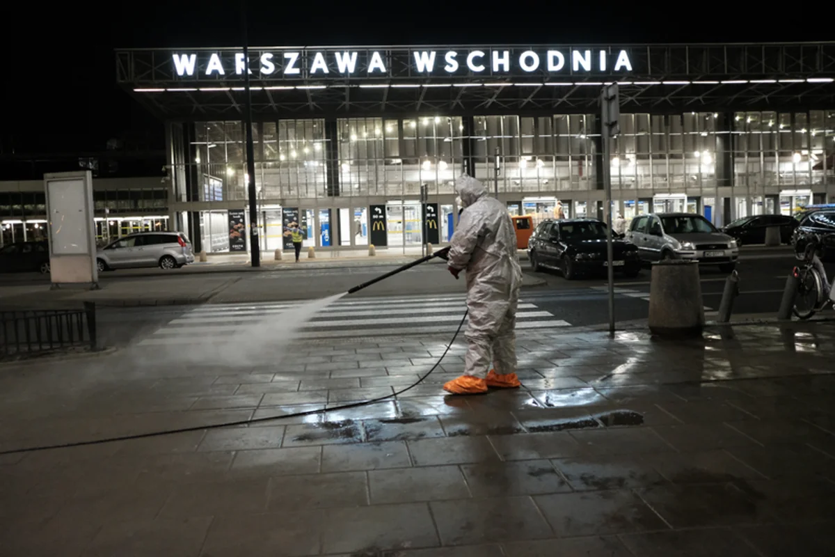 Nocna dezynfekcja ulicy przed stołecznym dworcem kolejowym Warszawa Wschodnia. Zdjęcia ekip sprzątających polskie miasta zaczęły w ostatnich tygodniach do złudzenia przypominać te z chińskich miast. 9 kwietnia, Warszawa