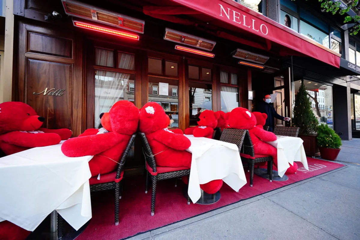 Restauracja na Manhattanie, w czasie pandemii oferująca dania wyłącznie na wynos, wyjątkowo kreatywnie pokazuje klientom, że nie mogą na razie usiąść przy stoliku. Nowy Jork, 7 kwietnia
