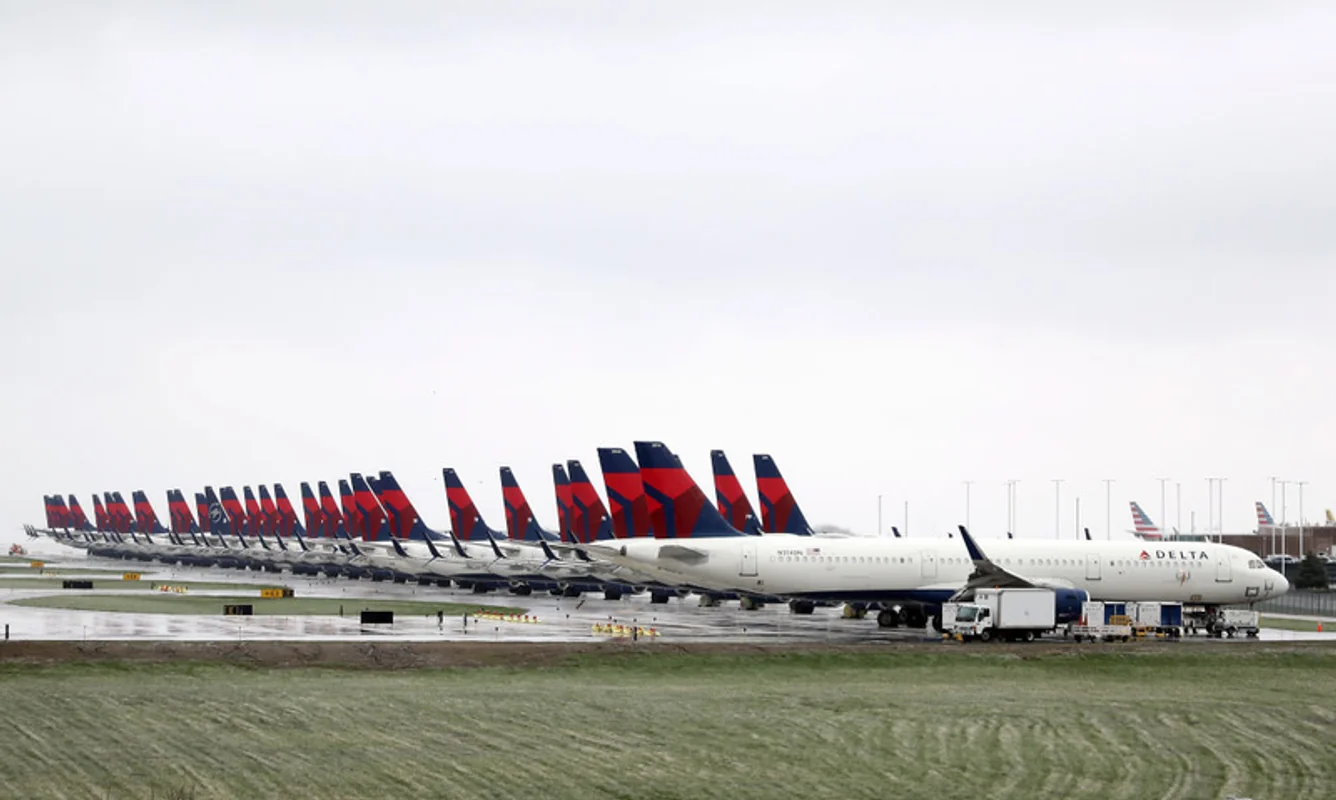 Samoloty należące do amerykańskich linii lotniczych Delta parkują na lotnisku w Kansas City w stanie Missouri. Pandemia uderzyła w pierwszej kolejności w branżę lotniczą, gdy kolejne kraje zaczęły ograniczać lub wstrzymywać ruch lotniczy. Międzynarodowe Zrzeszenie Przewoźników Powietrznych IATA szacuje, że linie lotnicze w 2020 roku mogą stracić 252 mld dol. przychodów. Delta straciła w marcu prawie 2 mld dol. i uziemiła połowę swojej floty, by zminimalizować straty. 3 kwietnia, Kansas City, Stany Zjednoczone