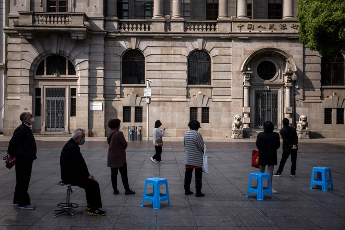 Starsi mieszkańcy Wuhan w Chinach stoją w kolejce przed jednym z banków. Miasto, w którym zaczęła się epidemia koronawirusa, żyło w ścisłej izolacji przez 11 tygodni. Zaczęło znosić restrykcje dopiero na początku kwietnia. 8 kwietnia, Chiny