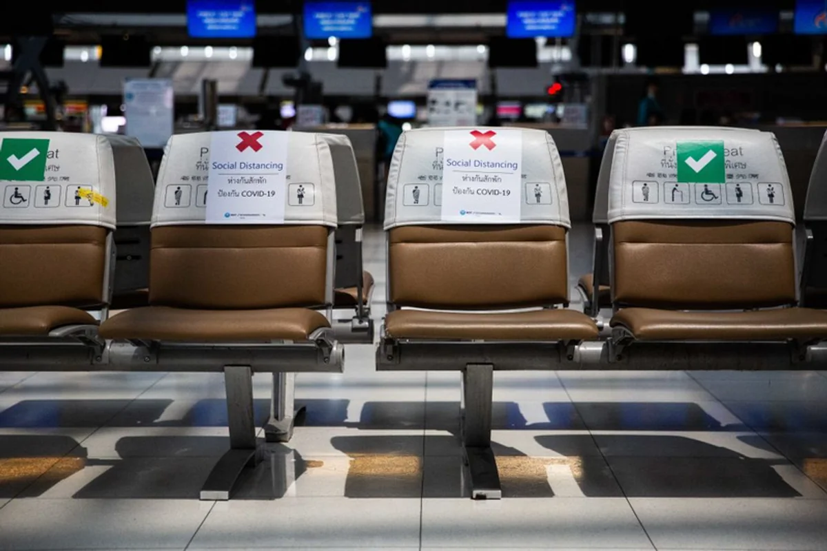 Siedzenia na opustoszałym lotnisku Suvarnabhumi w Bangkoku z oznaczeniami nakazującymi zachowanie odległości od innych. Władze Tajlandii zawiesiły loty międzynarodowe do kraju 3 kwietnia. Nakazano też zamknięcie centrów handlowych, niektórych sklepów, miejsc rozrywki i wprowadzono godzinę policyjną od 22:00 do 4:00. Zapowiedziano też 10-dniową prohibicję, by ograniczyć kontakty międzyludzkie. 3 kwietnia, Tajlandia