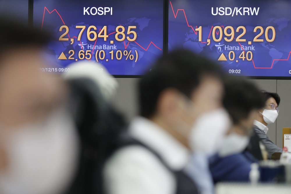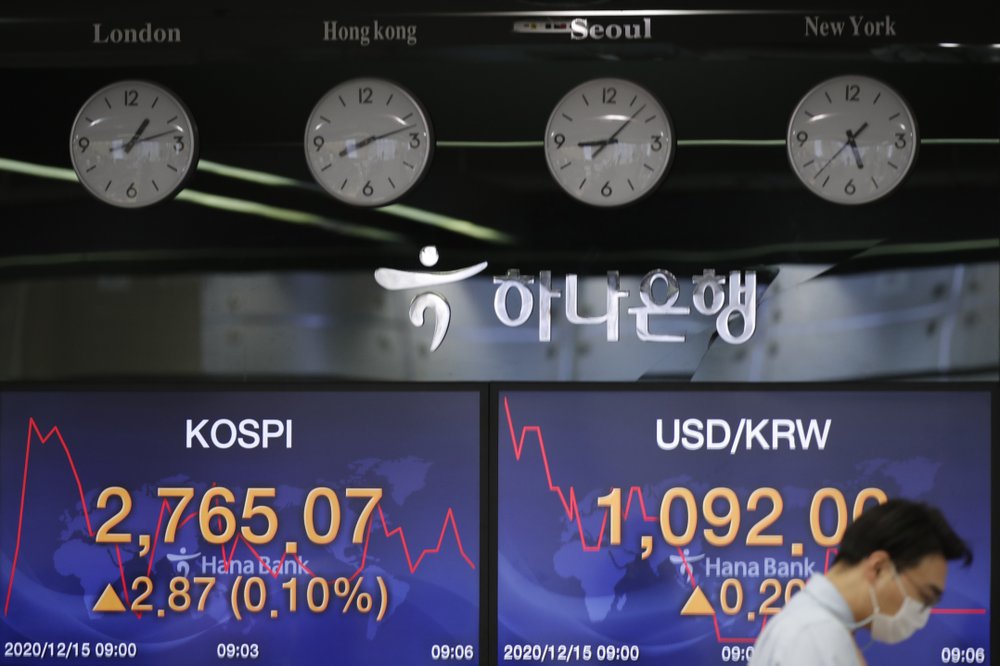 Inwestor walutowy podchodzi do ekranu pokazującego indeks cen akcji koreańskich (KOSPI) w pokoju wymiany walut w Seulu, w Korei Południowej, we wtorek, 15 grudnia 2020 r. Akcje azjatyckie spadły we wtorek po słabym dniu na Wall Street. inwestorzy czekają, aby przekonać się, czy Kongres może przełamać zastój w dostarczaniu większej pomocy ludziom, firmom i samorządom dotkniętym pandemią koronawirusa. (Zdjęcie AP / Lee Jin-man) Akcje azjatyckie spadły we wtorek po słabym dniu na Wall Street, gdy inwestorzy czekają, czy Kongres może przerwać spór związany z dostarczaniem większej pomocy ludziom, firmom i samorządom dotkniętym pandemią koronawirusa. Japoński referencyjny indeks Nikkei 225 spadł po tym, jak premier Yoshihide Suga ogłosił zawieszenie programu promocji podróży, który pomógł firmom, ale również przyczynił się do odrodzenia się epidemii koronawirusa. Program został zawieszony od 28 grudnia do stycznia. 11, w zasadzie przez cały okres szczytu noworocznego, kiedy większość rodzin wyjeżdża na wakacje lub wraca do swoich rodzinnych miast. Program Go To Travel i inny nazwany Go To Eat zapewniały głównie wysokie rabaty na pokoje hotelowe i posiłki oraz pomogły złagodzić cios spowodowany utratą prawie całej turystyki zagranicznej przybywającej z powodu kontroli i obaw związanych z pandemią.